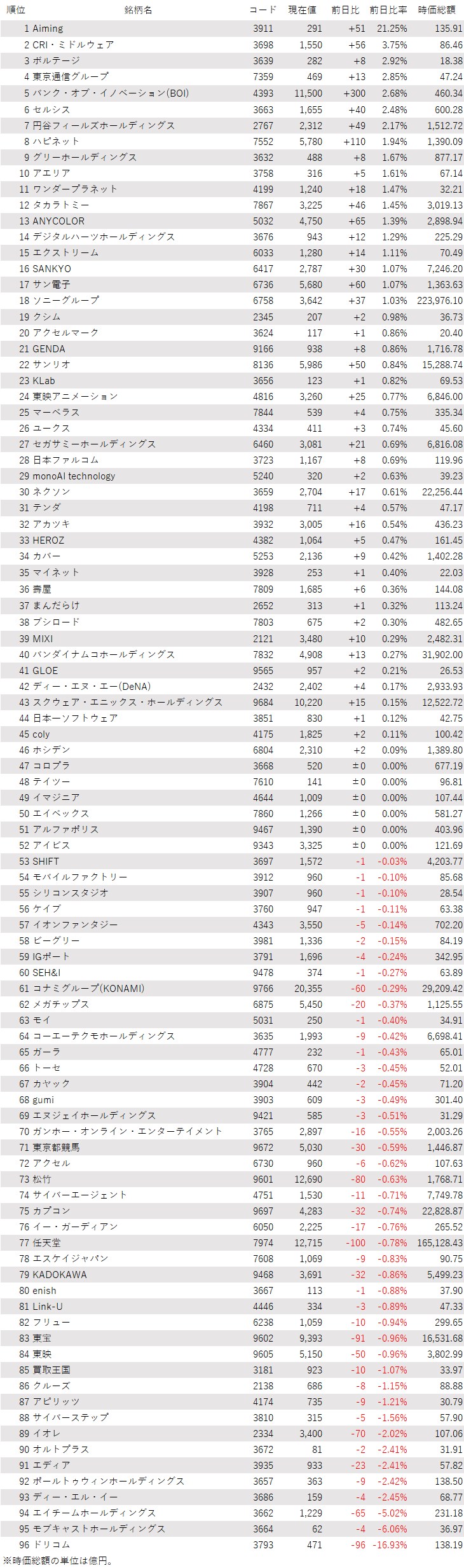 そうした中でゲーム・エンタメ関連株の動きを見てみると、下記の表に登録しているゲーム・エンタメ関連企業96銘柄のうち、上昇は46銘柄(48%)、下落は44銘柄(46%)、変わらずは6銘柄(6%)で、上昇した銘柄のほうが多かった。