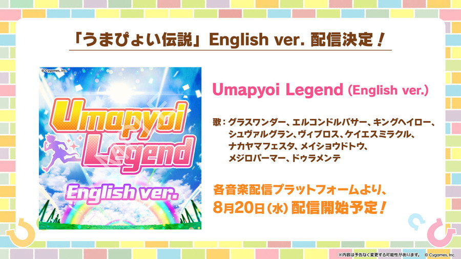 2025年8月20日から、各音楽配信プラットフォームで「うまぴょい伝説」English ver.の配信が決定した。