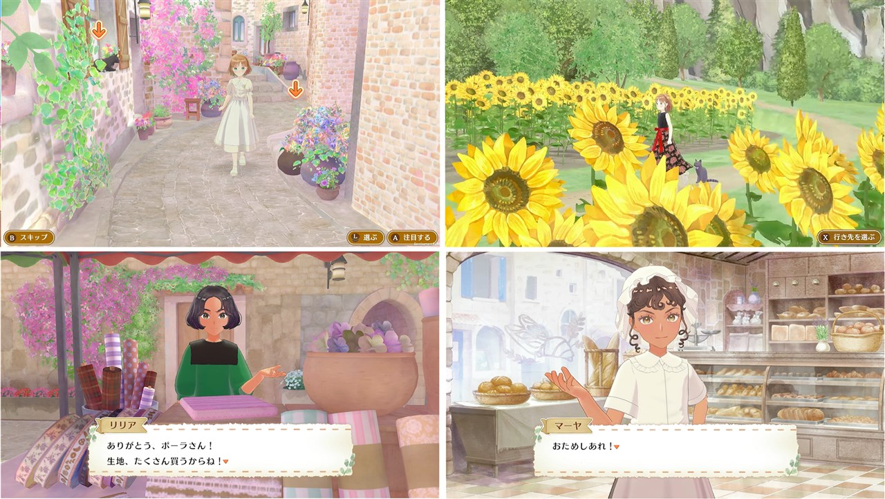 舞台であるフルーヌ村には、石畳の街並みや一面に広がる花畑、目移りするほどの生地が並ぶマルシェ、香ばしい匂いが漂うパン屋などまるで絵本の1ページを切り取ったような美しい風景が広がっている。