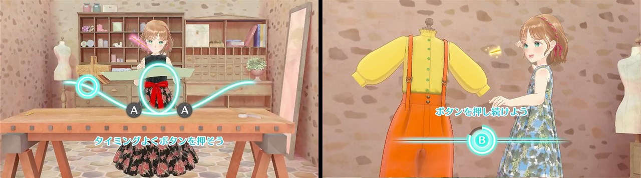 生地やデザインが決まったら「針の魔法」「はさみの魔法」など、4つの裁縫魔法を使ったミニゲームで仕上げる。