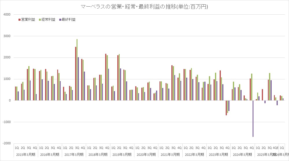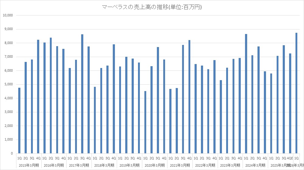 マーベラス<7844>は、7月31日、2026年3月期 第1四半期の連結決算を発表し、売上高87億3900万円(前年同期比50.5%増)、営業利益2億4300万円(同272.4%増)、経常利益2億1900万円(同41.3%減)、最終利益1億1200万円(同43.2%減)だった。