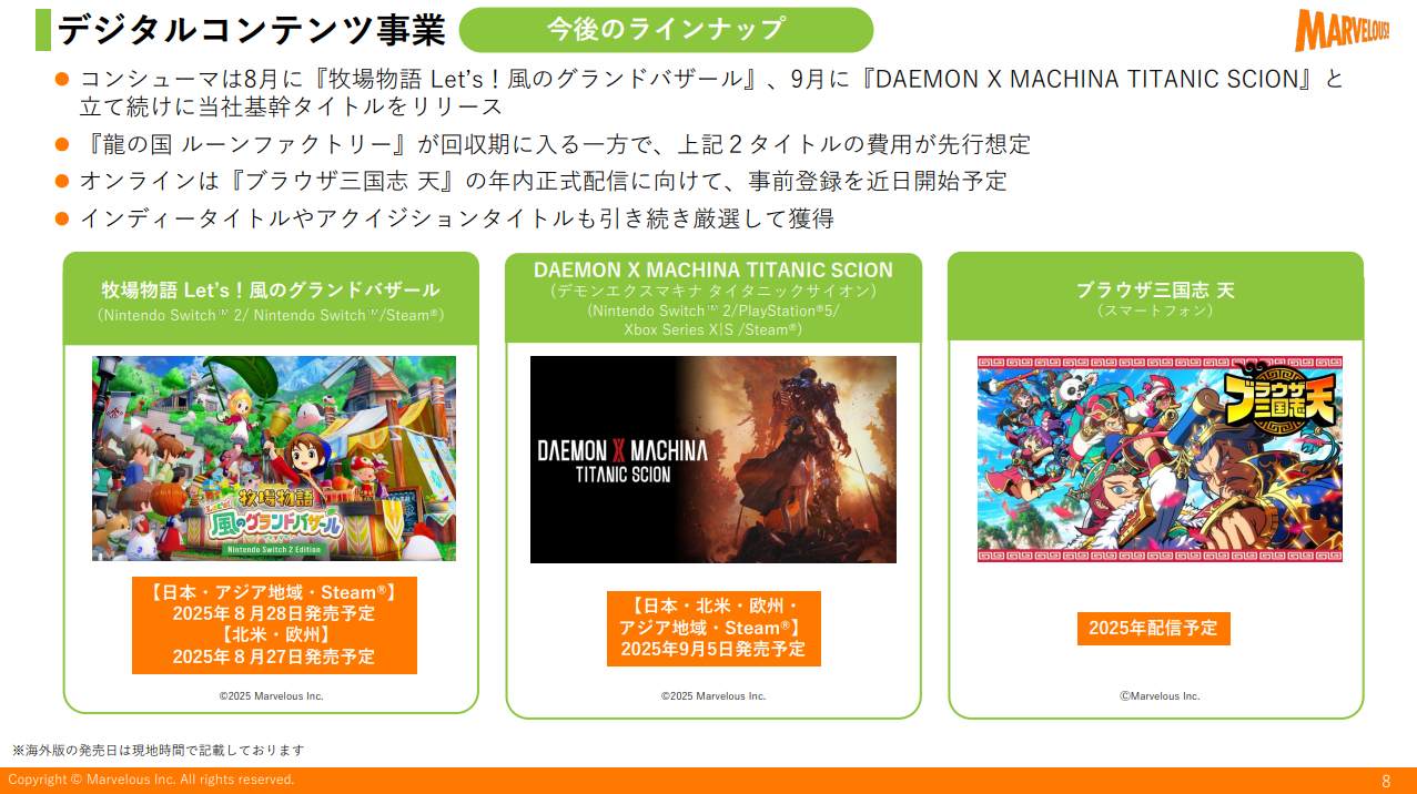 コンソールゲームは、昨今、デジタル販売が普及し、セールや無料アップデート、DLC配信などの施策を通じて、運用型ゲームのように長期的な収益獲得が可能になっている。『龍の国 ルーンファクトリー』も今後利益貢献してくるものとみられる。