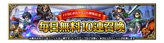 期間中1日1回毎日行える『FFBE4th』イベント開催記念の「毎日無料10連召喚」を実施中。