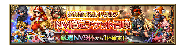期間限定イベント「精鋭部隊カレドヴルフ」ボックス召喚から手に入る「NV確定召喚チケット」は厳選NVユニット9体から1体確定で召喚可能。
