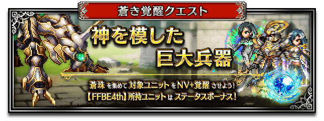 なお、新ユニット「革新の剣リュース」「始まりの伝説スネフリンガ」は、同時期に開催中の蒼き覚醒クエスト「神を模した巨大兵器」の報酬として手に入る強化アイテムでNeo Vision+(NV+)に覚醒することができる。