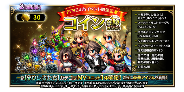 7月31日(木)より、「FFBE4thイベント開催記念召喚コイン2025/8」30個で1回召喚可能な「FFBE4thイベント開催記念コイン召喚2025/8」を開催。「FFBE4thイベント開催記念ミッションII」で獲得可能な「FFBE4thイベント開催記念召喚コイン2025/8」を集めて、一部【守りし者たち】カテゴリNVユニットを手に入れよう!