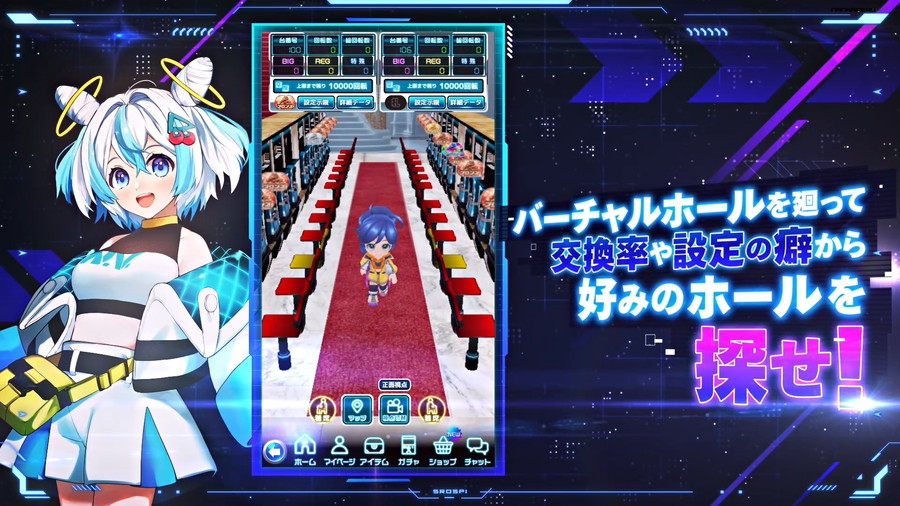 「スロスピ」は、パチンコ・パチスロの楽しさに立ち返りつつ、実際のホールの興奮を疑似体験できるバーチャルホール。3Dモデルで再現したホールで、最新機種から往年の名機まで、実機シミュレーターをプレイできる。