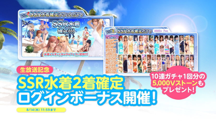 「SSR水着2着」や「無償Vストーン×5,000個」などがもらえる。また、公式生放送報酬として「SSR確定ガチャチケット」も配布中。