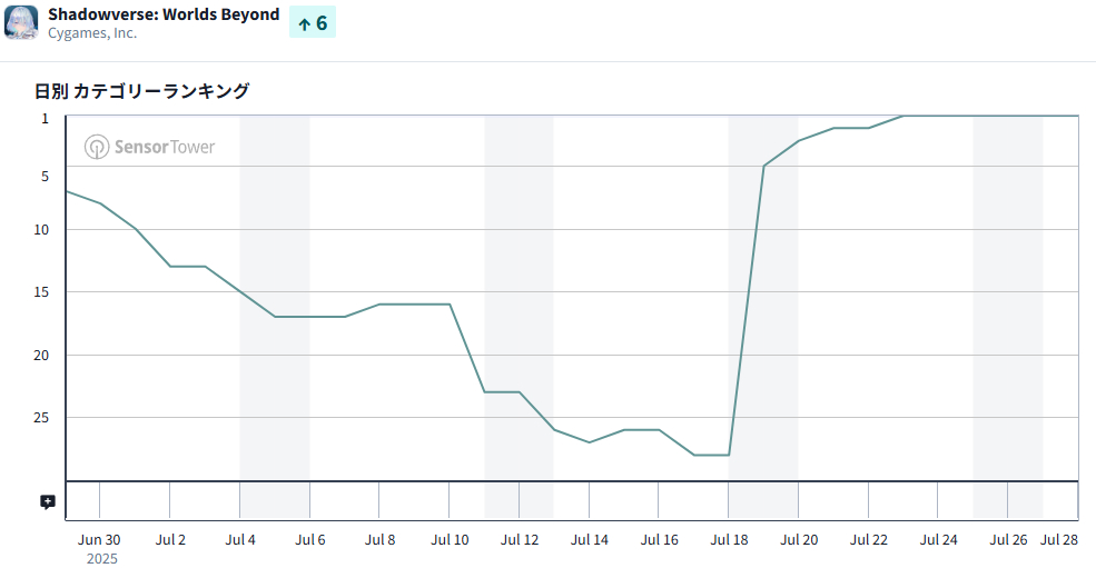 ランキングの更新停止期間中も、Cygamesの『Shadowverse: Worlds Beyond』が7月17日にリリースした第2弾カードパック「Infinity Evolved / インフィニティ・エボルヴ」の効果で、6日連続で首位を維持している。