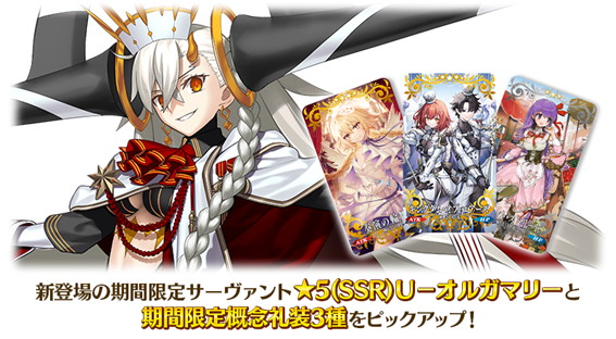 新登場の期間限定サーヴァント「★5 (SSR)U-オルガマリー」と期間限定概念礼装3種をピップアップする。さらに、今後ストーリー召喚に追加される概念礼装1種が先行登場する。