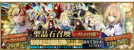 クラス別×宝具効果別にグループ分けした38種の中から、いずれか1つのみ召喚可能となる「10 周年記念福袋召喚(クラス別×宝具効果別)」の開催を発表した。選んだ召喚に対応した期間限定★5 (SSR)サーヴァントが1騎確定する。さらに、選んだ召喚に対応した期間限定を含む★4 (SR)以上のサーヴァントも1騎確定となる。