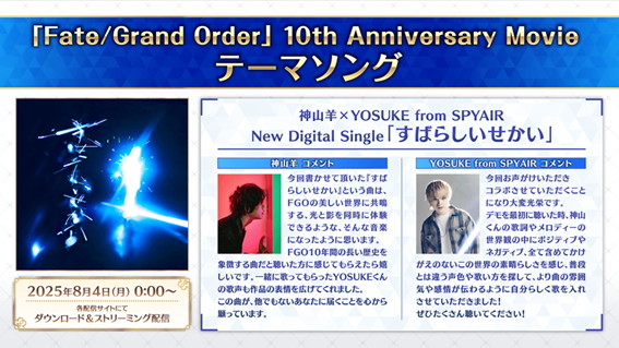 「Fate/Grand Order」10th Anniversary Movie のテーマソング「すばらしいせかい」のダウンロード&ストリーミング配信が決定した。
