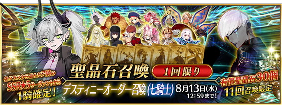 自分が選んだ★5 (SSR)サーヴァント7騎の中から1騎が確定の11回召喚をできる【期間限定】「デスティニーオーダー召喚」の開催を発表した。また、今回は「デスティニーオーダー召喚(七騎士)」と「デスティニーオーダー召喚(エクストラ)」を同時開催する。「デスティニーオーダー召喚(七騎士)」と「デスティニーオーダー召喚(エクストラ)」では、期間限定を含むすべての召喚分類の★5 (SSR)サーヴァントをクラスごとに7騎選択し、その中からランダムで1騎のみを確定で召喚できる。