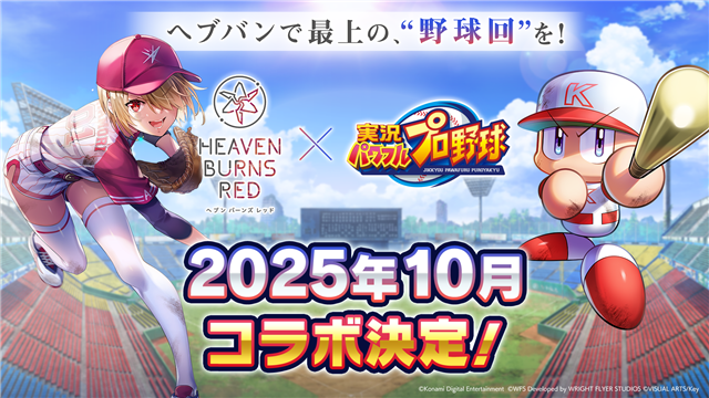 『ヘブンバーンズレッド』と、コナミデジタルエンタテインメントが運営するモバイルゲーム『実況パワフルプロ野球(パワプロアプリ)』とのコラボが2025年10⽉に開催決定した!ヘブバンで最上の、”野球回”を︕と題して、初のパワプロコラボをお届けする。続報をお楽しみに!