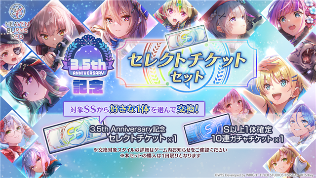 本アイテムセットは、「3.5th Anniversary記念セレクトチケット」と、「S以上1体確定10連ガチャチケット」がセットになった商品。「3.5th Anniversary記念セレクトチケット」では、対象SSから好きな1体を選んで交換することができる。