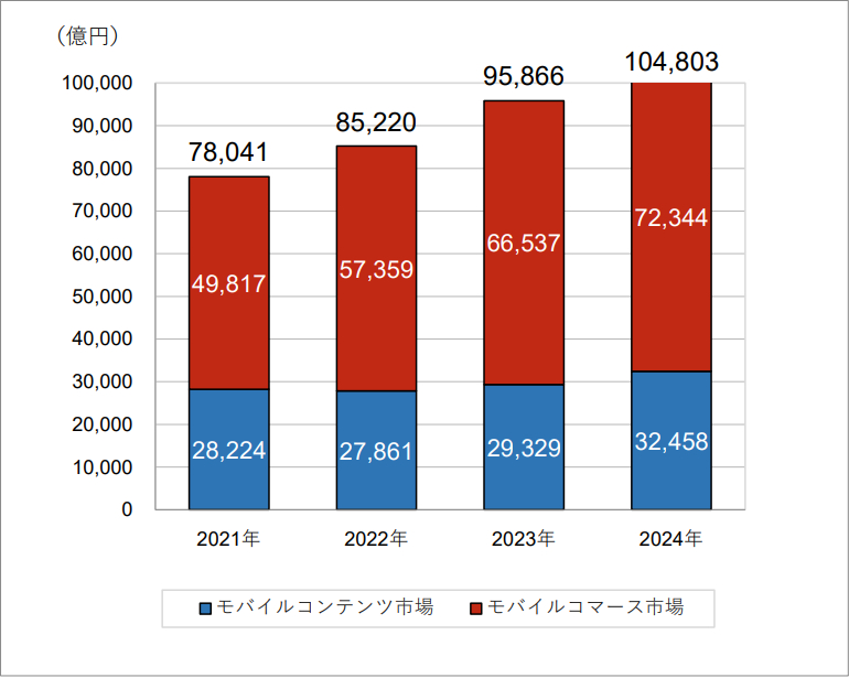 2024年の「モバイルコンテンツ市場」の市場規模は対前年比11%増の3兆2458億円となった。スマートフォン等の売上を対象としている。スマートフォン等市場はインターネット接続可能なオープンOS上でアプリ、ブラウザ等を用いて汎用的な利用ができる端末をスマートフォン等(タブレット含む)と定義し、スマートフォン等に係るデジタルコンテンツを販売する市場をモバイルコンテンツ市場(フィーチャーフォンのコンテンツサービス終了にともない2022年からスマートフォン等市場のみ)と定義している。