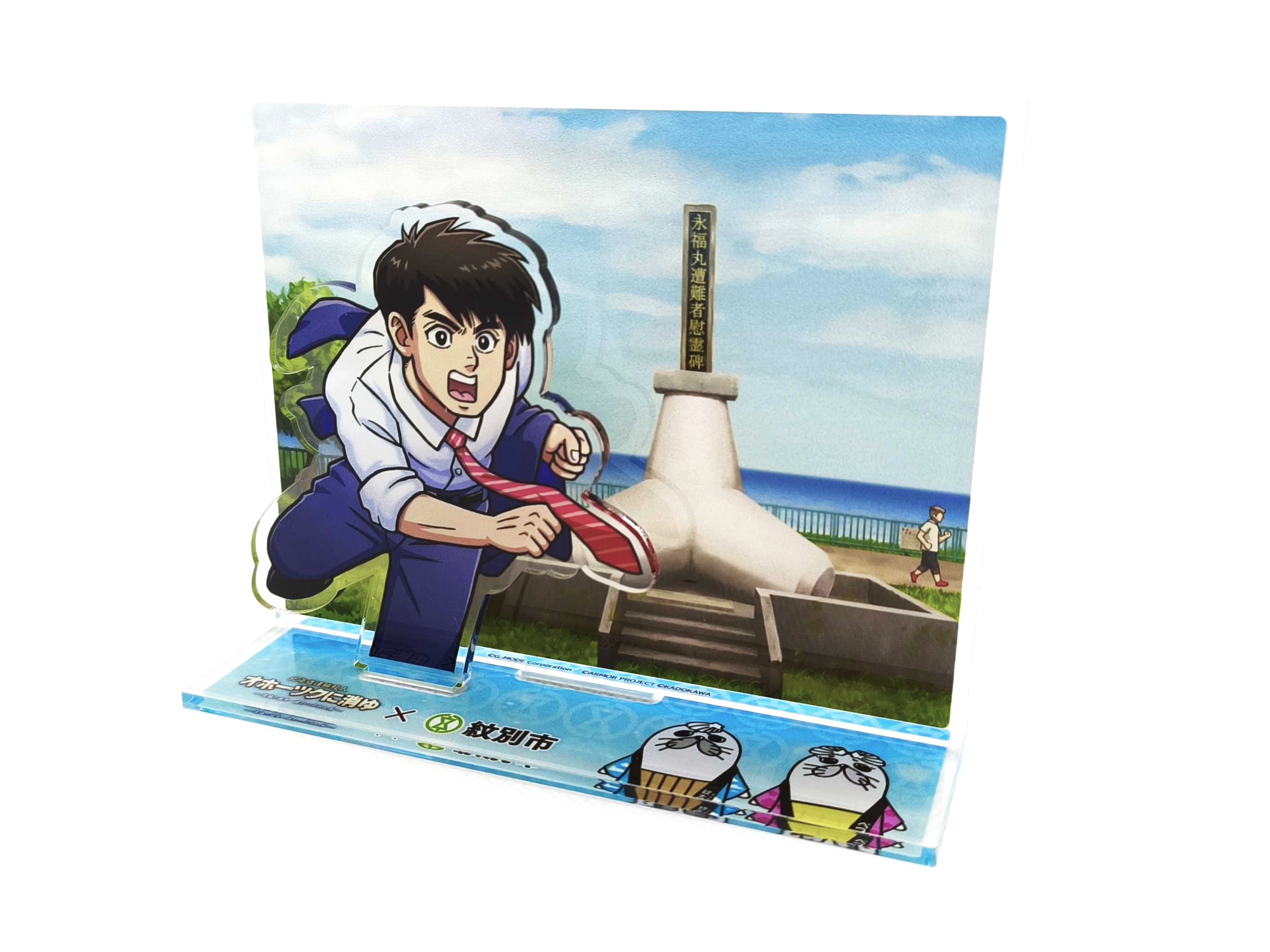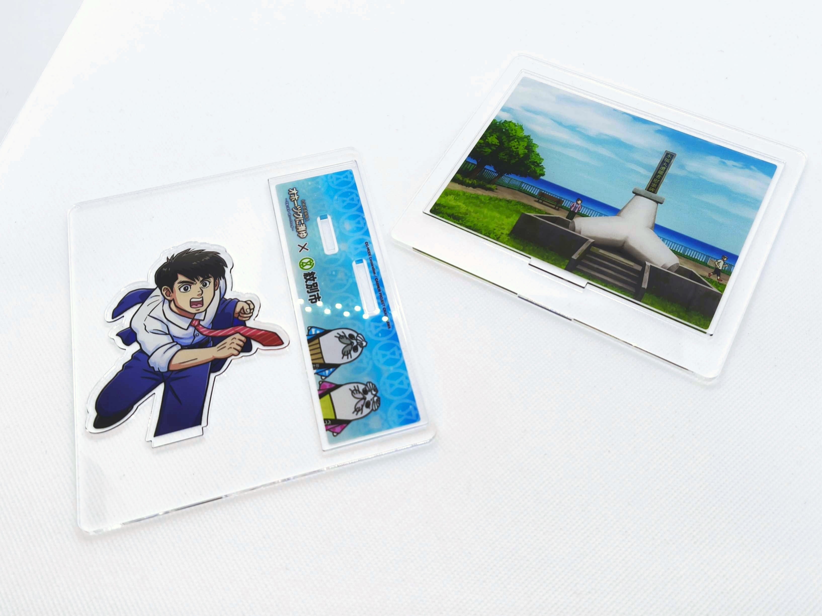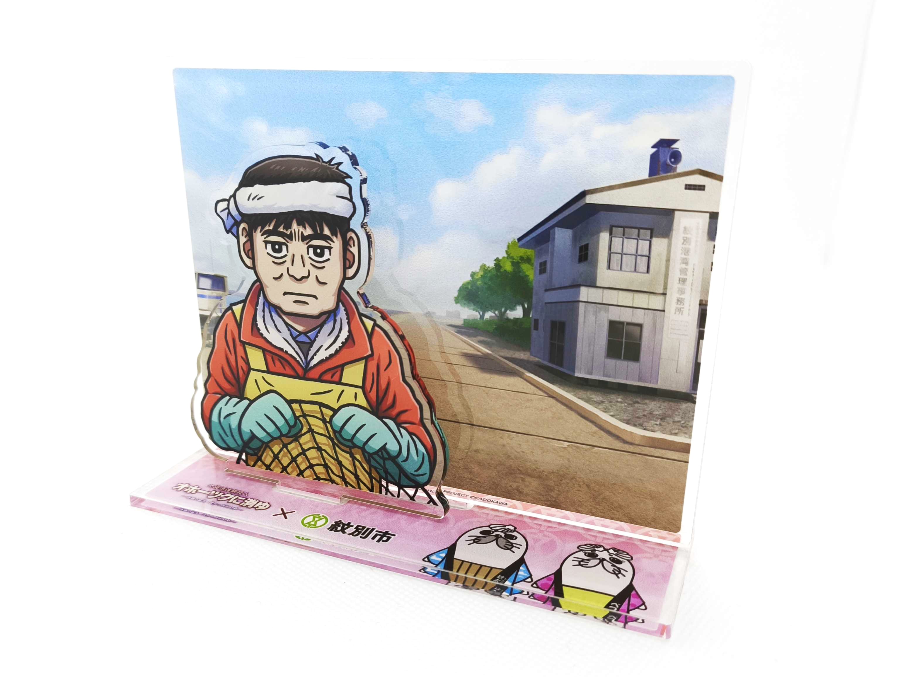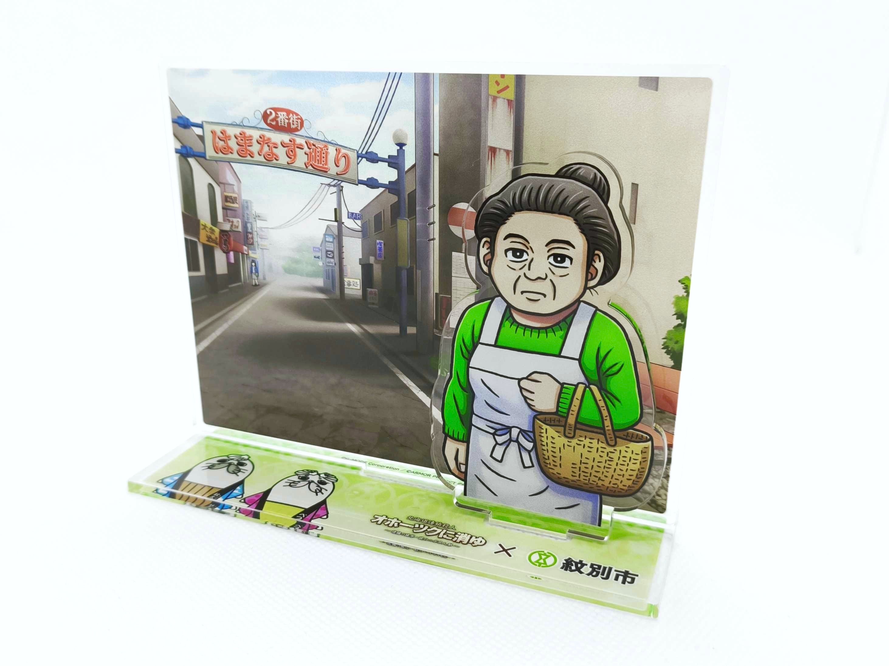 アクリルジオラマのスタンド部分には、北海道紋別市のキャラクター「紋太」「べつこ」のイラスト入り。