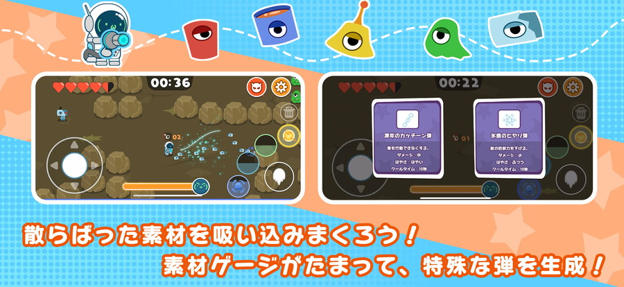 本作は、敵の素材を吸い込みまくり、作った弾で強敵を倒す、「ビルド構築2Dアクションゲーム」。新人の掃討者「キュポル」となり、銀河を脅かす強敵を一掃したい。