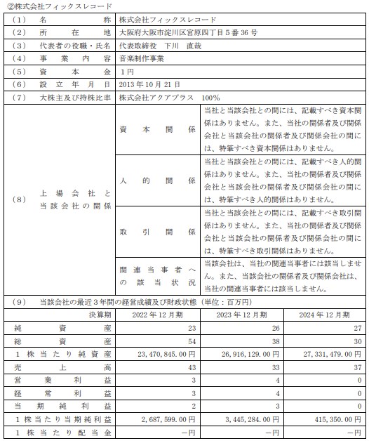 また、アクアプラスの子会社で音楽制作事業を手掛けるフィックスレコードも同社の子会社となる。