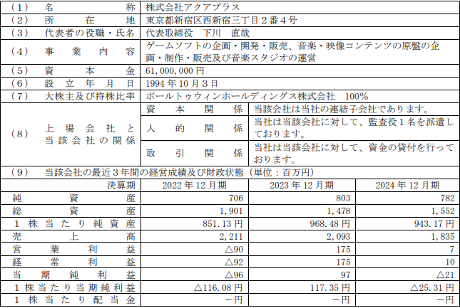 ポール・トゥ・ウィン・ホールディングス<3657>は、この日(8月4日)、連結子会社であるアクアプラスの全株式をユークス<4334>に8月29日付で譲渡することを決定し、2026年1月期決算で特別利益を計上すると発表した(ユークス側の発表)。金額は精査中。また、アクアプラスに対して有する貸付債権6億8000万円も放棄とならず、全額返済される予定であるとのこと。