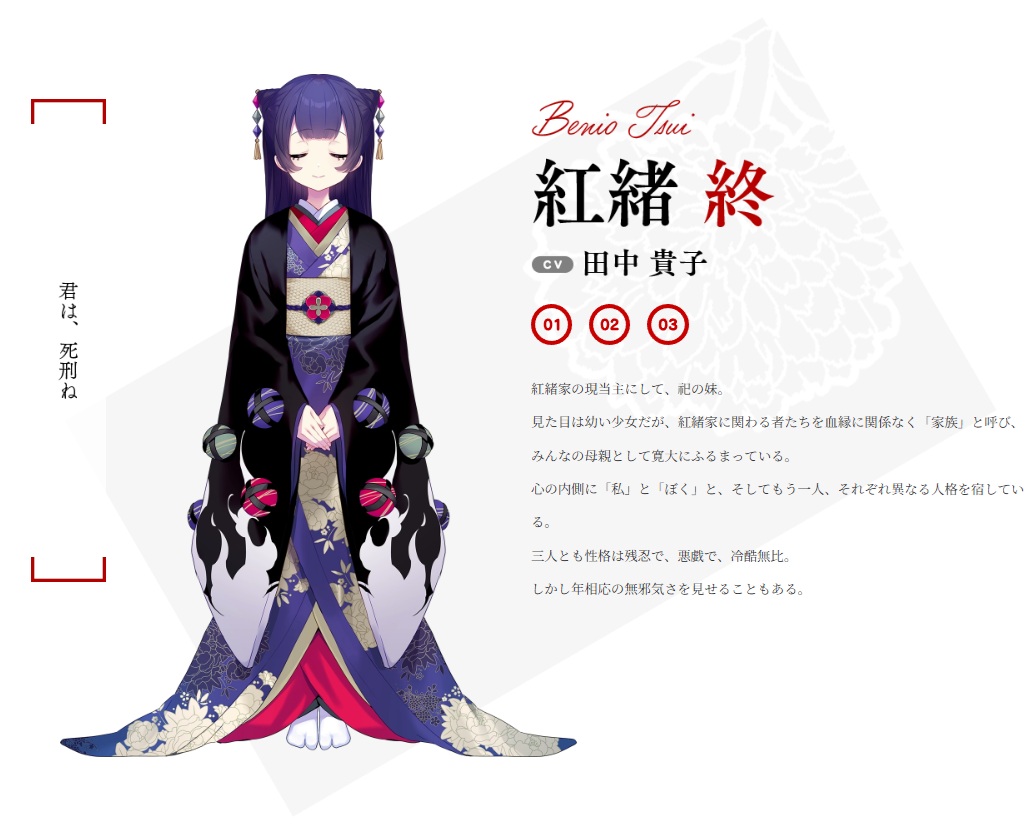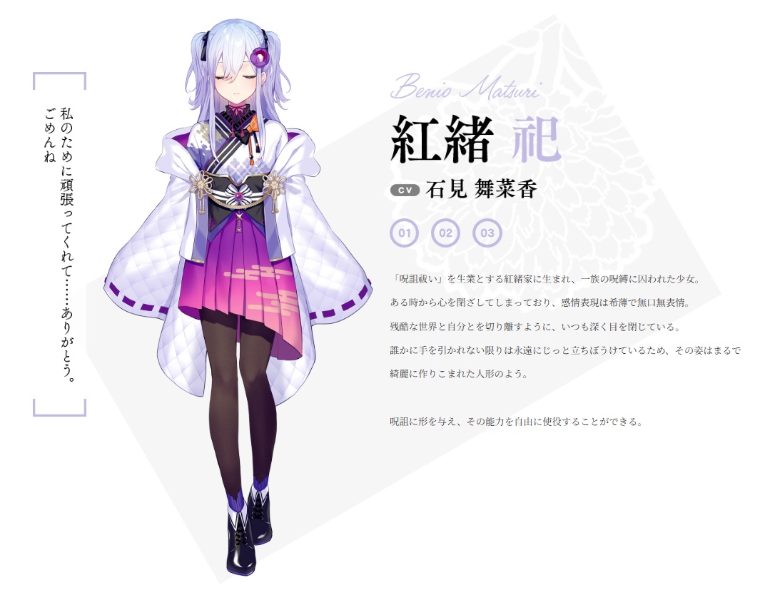 藤沢:だいぶ遠い記憶ですが、着物は確かに趣味でしたね。着付けも自分でやっていましたが、最近着る機会があまりないので忘れちゃいました(笑) 祀ちゃんと紅緒終(べにお つい)ちゃんの衣装はどちらも素敵ですが、個人的には終ちゃんの衣装ですかね。ただ終ちゃんは振袖なので実際着るとなると勇気が必要です(笑) 祀ちゃんの衣装も可愛いですけど、終ちゃんはより着物っぽくて、黒い羽織も私自身着た事がないのでカッコいいなと思います。何より終ちゃん自身が可愛いので(笑)