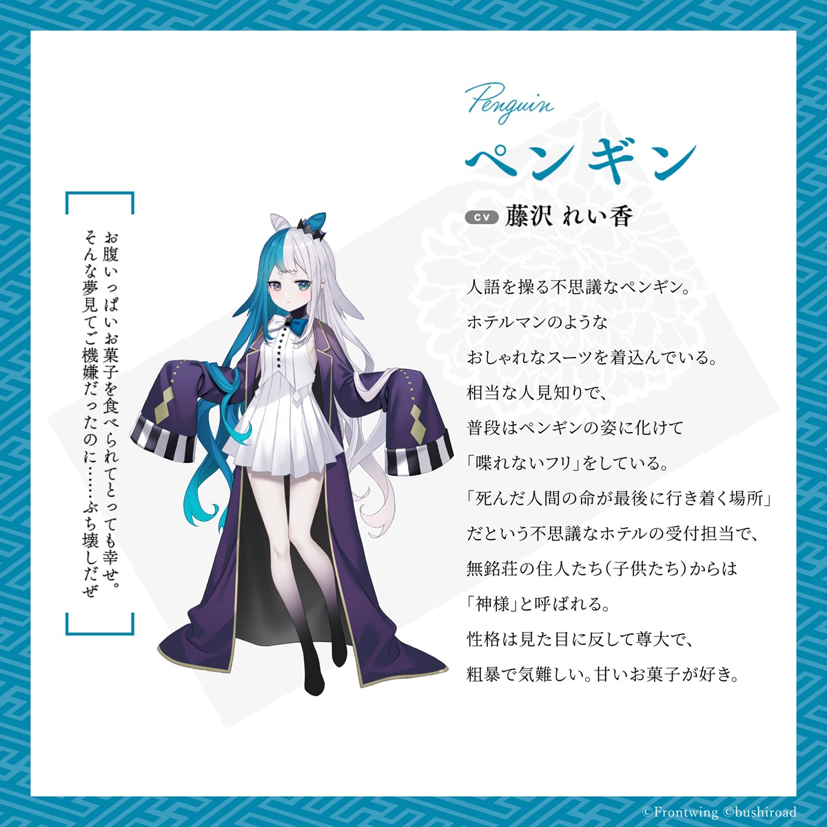藤沢:全体的に好き勝手やらせていただいたというのが正直な感想です。声優の仕事って文字情報を立体的にする、平面を三次元(立体情報)にする事だと思っています。文字のままだと味気ないセリフでも、セリフにすることで隣に話しているような印象を与えることができます。さらに、セリフの切り返しの部分にキャラクター性を加味する意味で、笑いやため息のアドリブが結構入っているなと私自身思いました。印象に残っているエピソードをピックアップするなら、勝手に言葉を変えた事と、勝手に泣いた事ですかね。「猫生(ねこせい)」というセリフがありまして、漢字で書いてある(実際のゲームでは漢字で皆さん認識される)し、「ねこせい」より「にゃんせい」のほうが可愛いと思って、何の打ち合わせもせずに読んだら通っちゃって嬉しかったです(笑) 漆原(雪人)先生もめちゃくちゃ喜んでくれたそうで、良かったなと思いました。あと台本のト書きで泣くという指定はほとんどなかったのですが、私は勝手に泣くタイプの役者なので、さっきお話した最後のシーンでは「ペンギンはここで絶対に泣く。何と言われようと泣く」という気持ちで収録に臨みました。