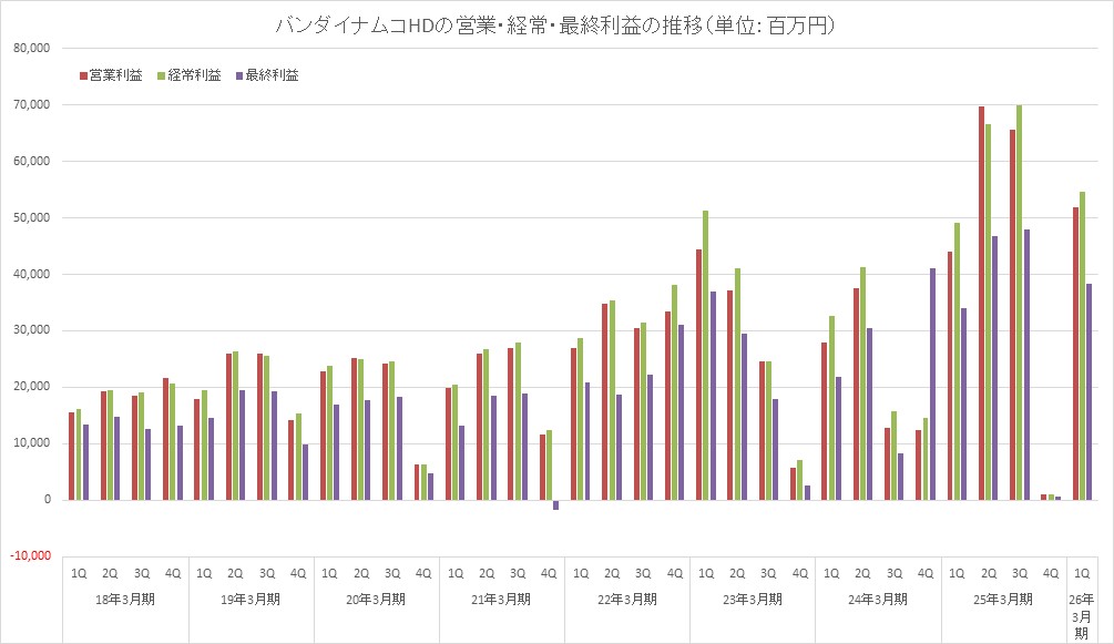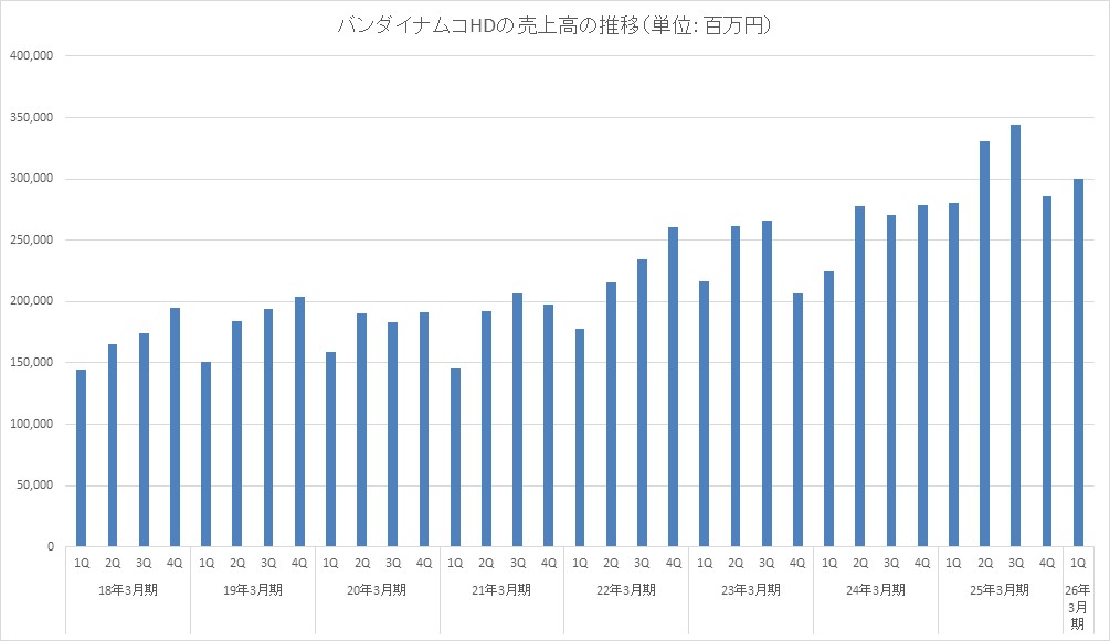 バンダイナムコホールディングス<7832>は、8月5日、2026年3月期 第1四半期の連結決算を発表し、売上高3004億3000万円(前年同期比7.1%増)、営業利益519億2100万円(同17.9%増)、経常利益546億5800万円(同11.4%増)、最終利益383億2900万円(同12.6%増)だった。