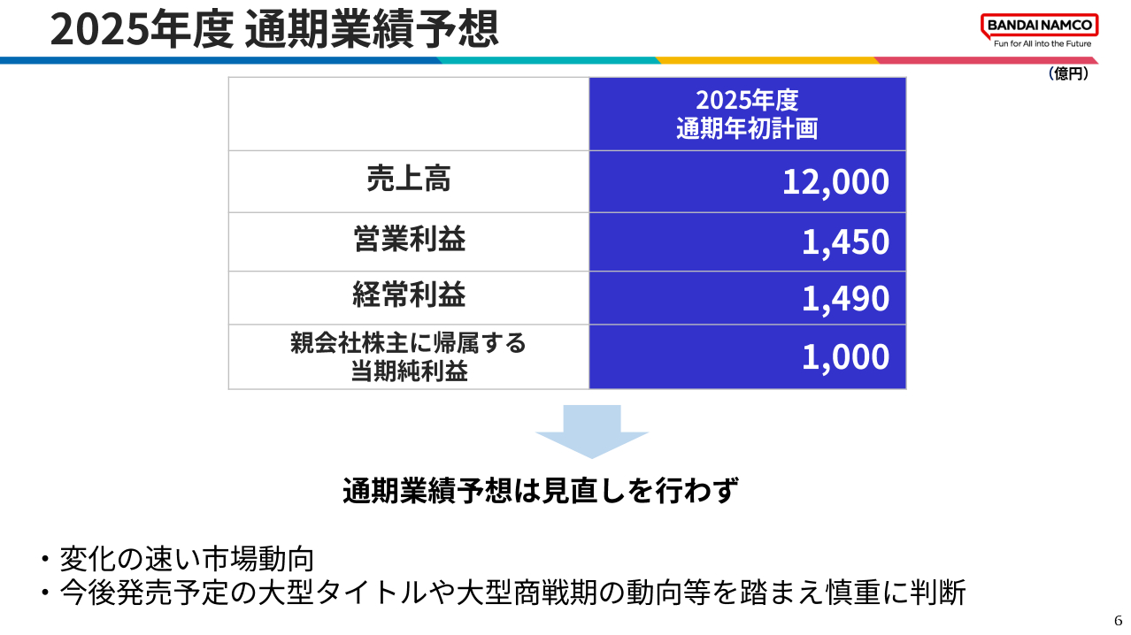 なお、2026年3月期通期の連結業績予想は見直しを行っていない。米国の政策動向や国内外におけるファンの嗜好の変化、競争環境の激化等の外部環境の動向、さらには第3四半期以降の大型タイトル等商品・サービスの販売動向や、年末年始の大型商戦の状況等を踏まえた上で精査する考え。