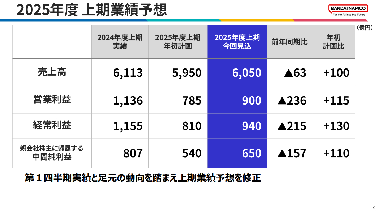 バンダイナムコHD、9月中間期の営業利益を785億円から900億円に上方修正 好調な第1四半期決算を受けて トランプ関税の影響は30億円と試算