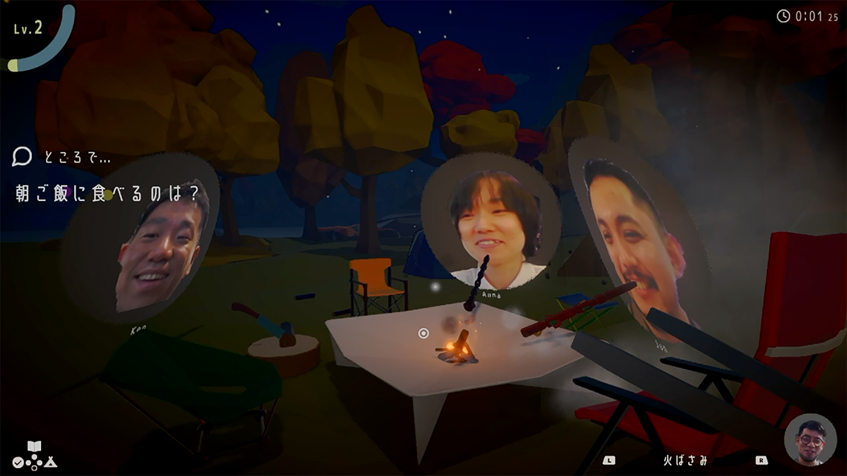 ひとりでじっくり遊ぶだけでなく、ゲームチャットやおすそわけ通信を使ったオンラインマルチプレイで、家族や友達と一緒に焚き火を囲むこともできる。カメラの映像が焚き火の周りに表示され、まるで本当に同じ場所にいるかのよう。協力して焚き火を育てたり、ひとり一台の焚き火台で腕を競い合ったり、自由なあそびが待っている。それだけでなく、トークテーマ機能で会話がよりいっそう盛り上がる。