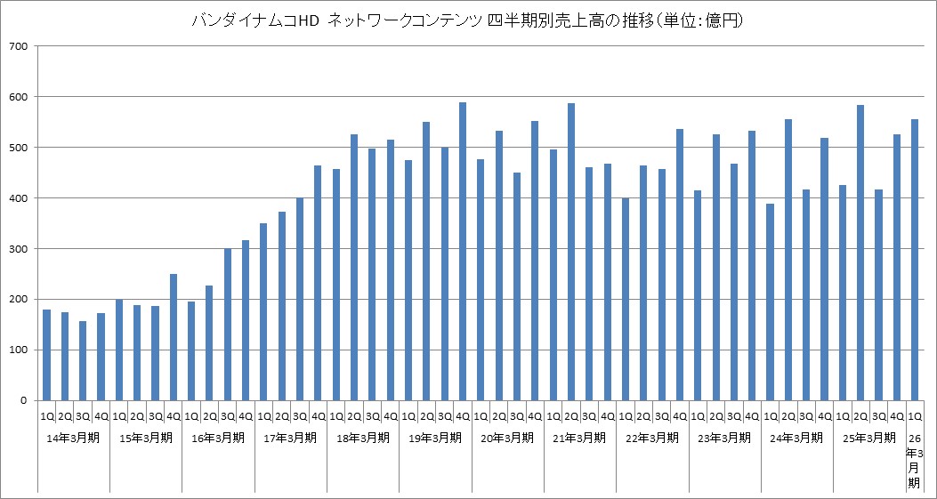 バンダイナムコホールディングス<7832>は、第1四半期の「ネットワークコンテンツ」の売上高が前年同期比30.8%増の556億円と大幅に伸びたことを明らかにした。『SDガンダム ジージェネレーション エターナル』が『機動戦士Gundam GQuuuuuuX』との相乗効果を活かして新たなファン層も獲得し好調にスタートした、としている。