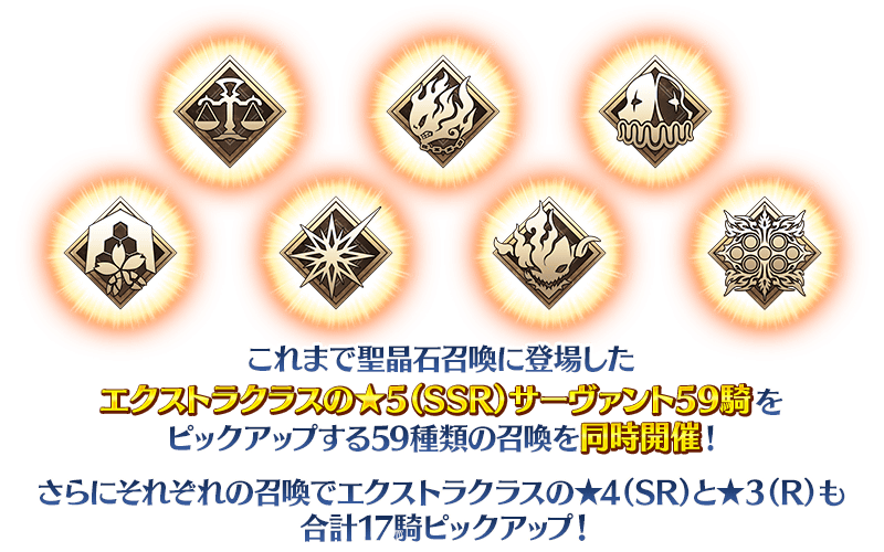 これまで聖晶石召喚に登場したエクストラクラスの★5(SSR)サーヴァント59騎をピックアップする59種類の召喚を同時開催。