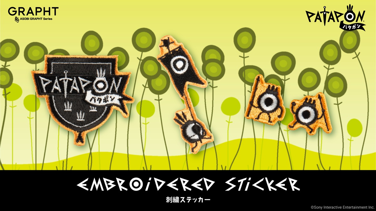 「パタポン」第1作目のタイトルロゴと、ハタポン、ヤリポンを黒、白、オレンジの刺繍糸で表現した。スマートフォン、ノートパソコン、タンブラーなどの硬質なアイテムや、アパレルなどの布製品に貼付することで、身近なアイテムを手軽にパタポンの世界観にカスタマイズ可能。