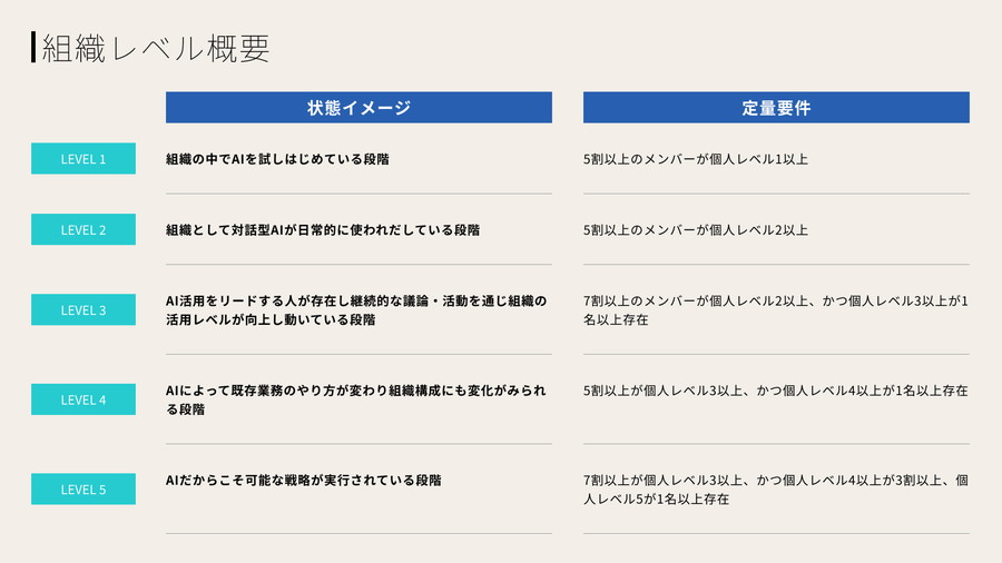 組織のAI活用フェーズに応じてレベル1から5までの段階を設定している。レベル1は「組織の中でAIを試し始めている段階」を示し、最上位のレベル5は「AIだからこそ可能な戦略が実行されている段階」を示している。