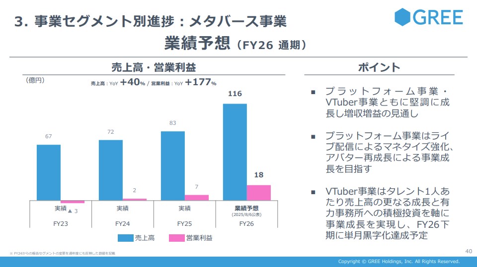 メタバース事業の2025年6月期通期の見通しについては、 プラットフォーム事業とVTuber事業ともに堅調に成長し、増収増益の見通し。