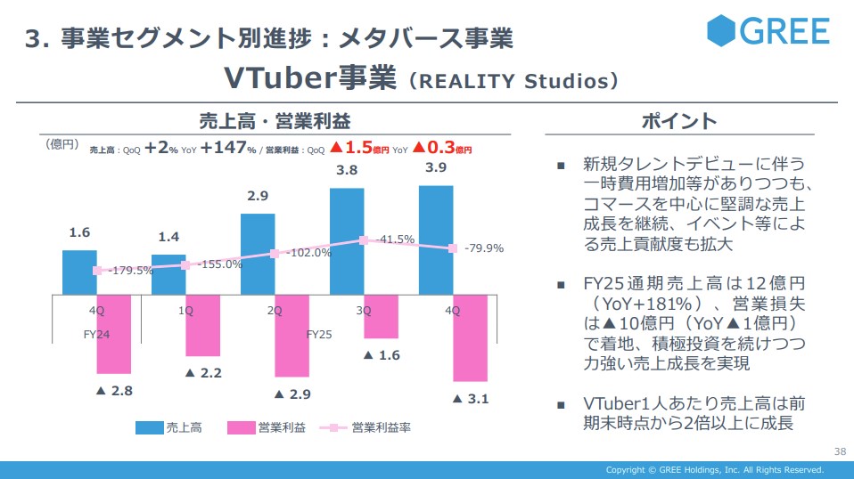 一方、REALITY StudiosのVTuber事業は、新規タレントデビューに伴う一時費用増加などがありつつも、コマースを中心に堅調な売上成長を継続した。