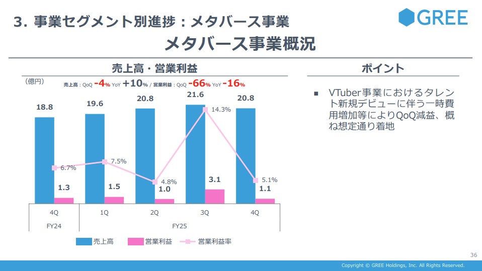 メタバース事業の第4四半期期間(4~6月)は、売上高20億8000万円(前四半期比4%減、前年同期比10%増)、営業利益1億1000万円(同66%減、同16%減)となった。