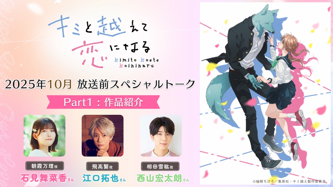 2025年8月7日より、TVアニメ『キミと越えて恋になる』のスペシャルトーク映像を、集英社DeNAプロジェクツ公式YouTubeチャンネルで公開する。本番組では、朝霞万理役の石見舞菜香をMCに迎え、飛高繋役の江口拓也、相田雪紘役の西山宏太朗の3名が出演し、全4回にわたって作品の見どころやキャラクターの魅力を、バラエティ豊かな企画を通してお届け。