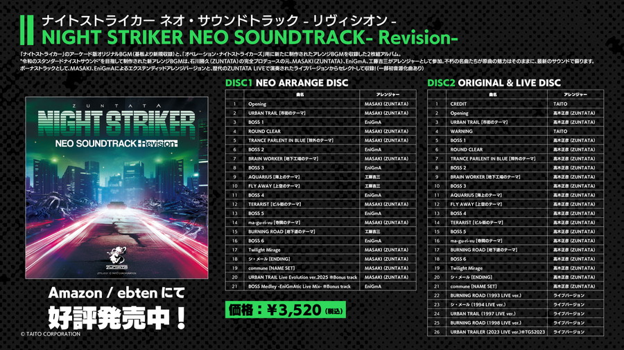 「ナイトストライカー」のアーケード版オリジナルBGM(基板より新規収録)と、「オペレーション・ナイトストライカーズ」用に新たに制作したアレンジBGMを収録した2枚組アルバム「ナイトストライカー ネオ・サウンドトラック -リヴィシオン-」も本日発売した。"令和のスタンダードナイストサウンド"を目指して制作した新アレンジBGMは、石川勝久(ZUNTATA)の完全プロデュースの下、MASAKI(ZUNTATA)、EniGmA、工藤吉三がアレンジャーとして参加。不朽の名曲たちが原曲の魅力はそのままに、最新のサウンドで蘇る。ぜひ楽しんでほしい。