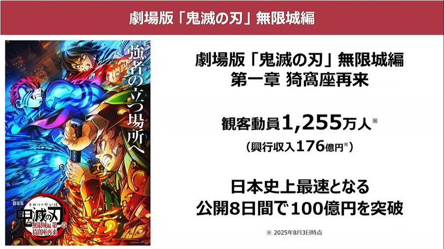 『劇場版「鬼滅の刃」無限城編 』第一章 猗窩座再来』は、7月18日に国内で公開がスタートし、8月3日時点で観客動員数は1255万人、興行収入は176億円を超えた。公開8日間での興行収入100億円突破は日本市場最速になるとのこと。