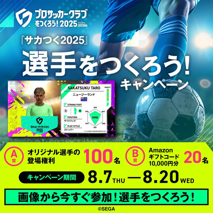 セガは、2025年配信予定のPlayStation5/PlayStation4/iOS/Android/PC(Steam)向けゲーム『プロサッカークラブをつくろう!2025』(以下、『サカつく2025』)において、「選手をつくろう!」キャンペーンを開催中だ。