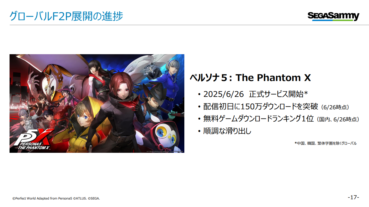 同社では、グローバル市場向けF2Pタイトルの新作『ペルソナ5: The Phantom X』が6月26日に正式サービスを開始し、順調なスタートを切った、としている。既存タイトルも想定内で推移したとのこと。