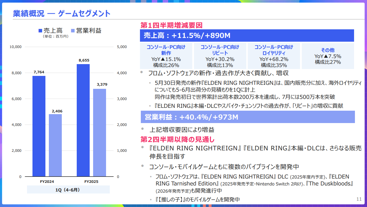 さらに『ELDEN RING NIGHTREIGN』のDLCを年度内に配信するほか、『ELDEN RING Tarnished Edition』 (2025年発売予定・Nintendo Switch 2向け)、『The Duskbloods』(2026年発売予定)の開発も進めているという。