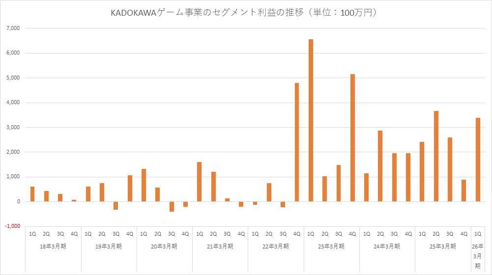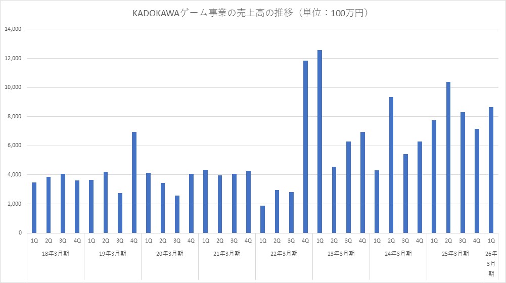 KADOKAWA<9468>は、26年3月期 第1四半期(25年4~6月)のゲーム事業の業績について売上高は86億5500万円(前年同期比11.5%増)、セグメント利益(営業利益)は33億7900万円(同40.4%増)と大幅増益だったことを明らかにした。