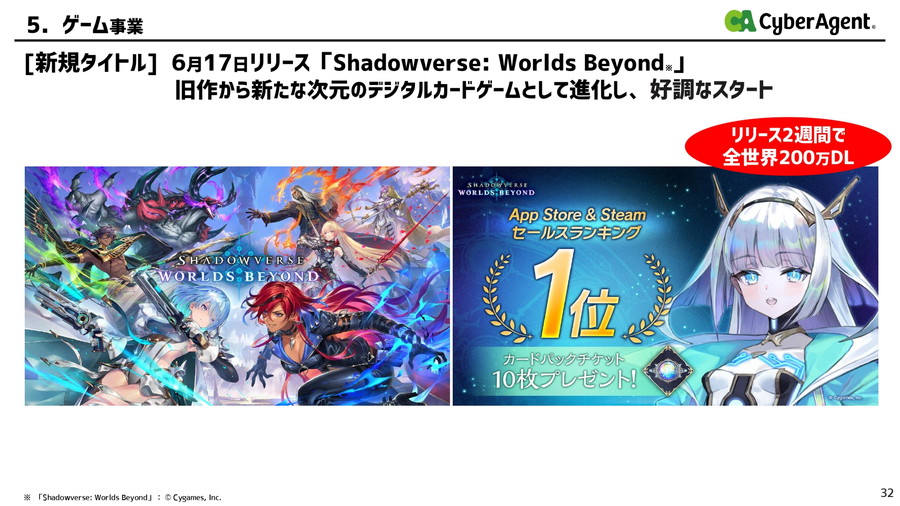 さらに『Shadowverse: Worlds Beyond』については、6月17日にリリースしたため、2週間の貢献となったが、「非常に大きなヒットになった」と業績にインパクトを与えたと述べた。