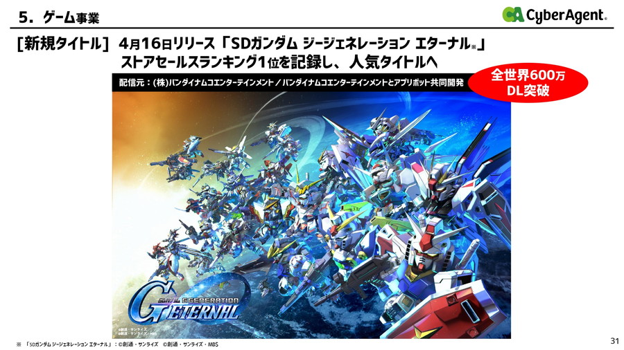 『SDガンダム ジージェネレーション エターナル』については、4月16日にリリースしたタイトルだが、「継続率が非常に高く、世界から愛されているIPであることを実感するような大ヒットと安定感」とコメントした。