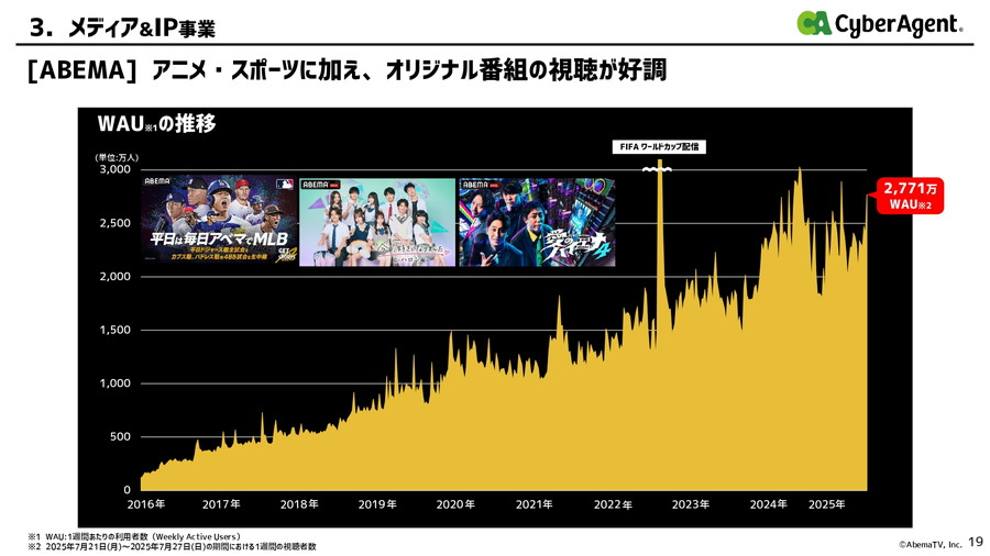 アニメ事業を含むメディア&IP事業は、「ABEMA」と周辺事業が重層的に売上を伸ばしており、25年4~6月では前年同期比17.7%増の561億円、営業利益は同7.8倍の22億円を記録した。MLBの放送や自社オリジナル番組がヒットし、高水準のWAU(週間アクティブユーザー数)を維持している。