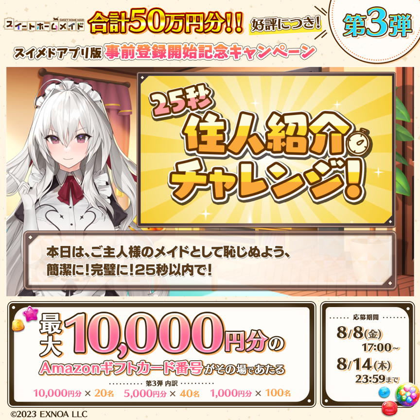 EXNOA、アプリ版「スイートホームメイド」事前登録者数3万人達成 総額50万円分のAmazonギフトカード番号が当たるCP開催