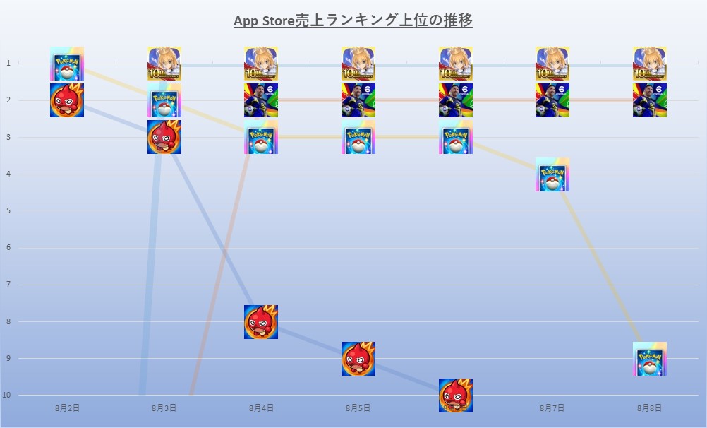 8月4日9時現在のApp Storeセールスランキング(ゲームカテゴリー)は、FGO PROJECTの『Fate/Grand Order』が50ランクアップで首位の座についた。