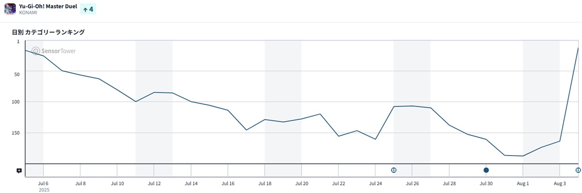 『eFootball』が8月4日からの「Epic: Japan」開催により2位に浮上し、また『遊戯王マスターデュエル』も新シークレットパックやセレクションパックの追加で164位から13位に大幅にランクアップするなど、KONAMIのタイトルが好調だった。